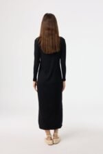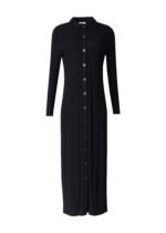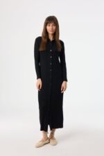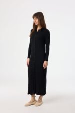 This dress is all about effortless style and comfort. With its long sleeves and chic collar. it’s perfect for those cooler days and nights when you still want to look your best. The ribbed fabric flatters your figure in all the right places. and the button-down front adds a touch of classic charm.